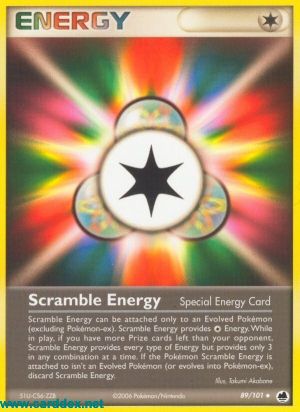 Beschreibung: Misch-Energie kann nur an ein entwickeltes Pokémon (außer Pokémon-ex) angelegt werden. Misch-Energie liefert -Energie. Während Misch-Energie im Spiel ist und du mehr Preise übrig hast als dein Gegner, zählt sie als jeder beliebige Energietyp, spendet aber 3 Energien in beliebiger Kombination auf einmal. Handelt es sich bei dem Pokémon, an dem Misch-Energie angelegt ist, nicht mehr um ein entwickeltes Pokémon (oder entwickelt es sich in ein Pokémon-ex), dann lege Misch-Energie auf deinen Ablagestapel. |