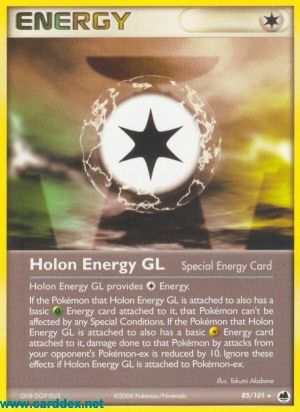 Wenn an dem Pokémon, an dem Holon-Energie PE angelegt ist, auch eine -Basis-Energiekarte angelegt ist, kann dieses Pokémon nicht von Speziellen Zuständen betroffen werden. Wenn an dem Pokémon, an dem Holon-Energie PE angelegt ist, auch eine -Basis-Energiekarte angelegt ist, werden die Schadenspunkte, die diesem Pokémon durch Angriffe gegnerischer Pokémon zugefügt werden, um 10 Schadenspunkte reduziert. Ignoriere diese Effekte, wenn Holon-Energie PE an ein Pokémon-ex angelegt ist. |