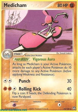 Solange Meditalis dein Aktives Pokémon ist, fügen Angriffe aller Aktiven Pokémon beider Spieler den Aktiven Pokémon 10 weitere Schadenspunkte zu (bevor Schwäche und Resistenz verrechnet werden).
