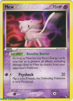 Solange an Mew mindestens eine Reaktionsenergiekarte angelegt ist,. verhindere alle Effekte, inklusice Schaden, die Mew durch Angriffe der Pokemon deines Gegners zugefügt werden.