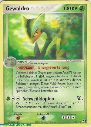 Während deines Zuges (vor deinem Angriff) kannst du beliebig oft 1 -Energiekarte, die an 1 deiner Pokemon angelegt ist, an ein anderes deiner Pokemon anlegen. Diese Poke-Power kann nicht benutzt werden, wenn Gewaldro von einem Speziellen Zustand betroffen ist.