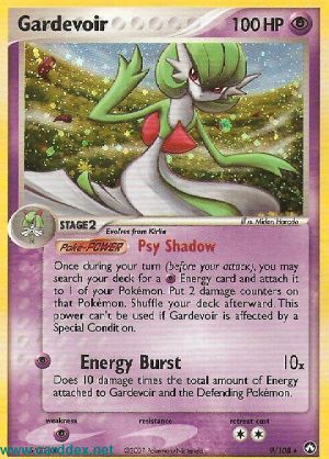 Einmal während deines Zuges (vor deinem Angriff) kannst du dein Deck nach einer -Energiekarte durchsuchen und an 1 deiner Pokémon anlegen. Lege 2 Schadensmarken auf dieses Pokémon. Mische dein Deck danach. Diese Poké-Power kann nicht benutzt werden, wenn Guardevoir von einem Speziellen Zustand betroffen ist.