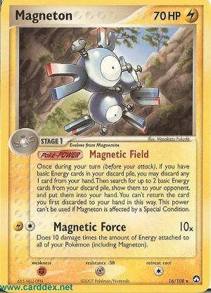 Einmal während deines Zuges (vor deinem Angriff), wenn mindestens 1 Basis-Energiekarte auf deinem Ablagestapel liegt, kannst du 1 Karte von deiner Hand auf den Ablagestapel legen. Wenn du das machst, durchsuche deinen Ablagestapel nach bis zu 2 Basis-Energiekarten, zeige sie deinem Gegner und nimm sie auf deine Hand. Du kannst auf diese Weise nicht die gerade abgelegte Karte auf die Hand nehmen. Diese Poké-Power kann nicht verwendet werden, falls Magneton von einem Speziellen Zustand betroffen ist.