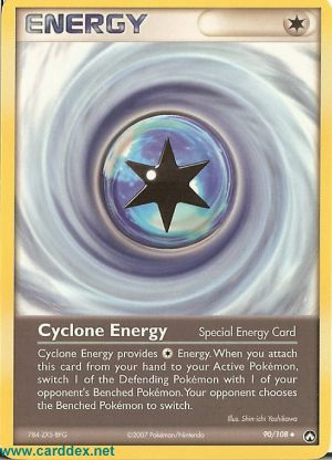 Zyklon-Energie liefert -Energie. Wenn du Zyklon-Energie von der Hand an dein Aktives Pokémon anlegst, tausche 1 Verteidigendes Pokémon mit 1 Pokémon auf der Bank deines Gegners. Dein Gegner bestimmt, welches Pokémon auf der Bank getauscht wird.