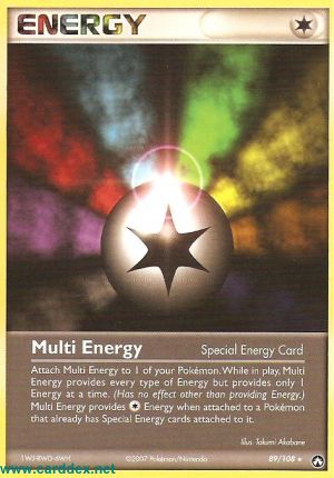 Lege Multi-Energie an 1 deiner Pokémon an. Während Multi-Energie im Spiel ist, zählt sie als jeder beliebige Basis-Energietyp, spendet aber immer nur eine Energie auf einmal. (Sie hat keinen Effekt, außer dass sie Energie spendet.) Multi-Energie zählt als -Energie, falls sie an ein Pokémon angelegt wird, an dem bereits eine Spezialenergiekarte angelegt ist.