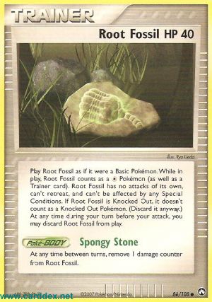 Beschreibung: Spiele Wurzelfossil wie ein Basis-Pokémon. Während Wurzelfossil im Spiel ist, zählt es als -Pokémon (anstatt einer Trainerkarte). Wurzelfossil hat keine Angriffe, kann sich nicht zurückziehen und wird nicht von Speziellen Zuständen betroffen. Falls Wurzelfossil kampfunfähig gemacht wird, zählt es nicht als kampfunfähig gemachtes Pokémon (lege es trotzdem ab). Jederzeit während deines Zuges vor deinem Angriff kannst du Wurzelfossil aus dem Spiel ablegen. |