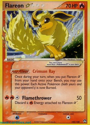 Einmal während deines Zuges, wenn du Flamara ☆ von deiner Hand auf deine Bank legst, kannst du diese Poké-Power einsetzen. Alle Aktiven Pokémon (deine und die deines Gegners) sind jetzt verbrannt.