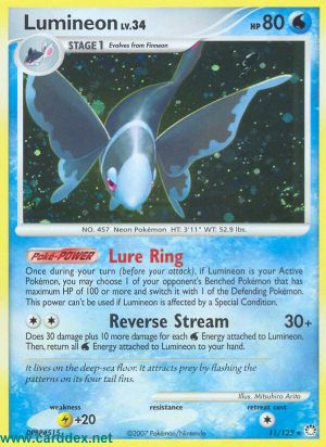 Einmal während deines Zuges (vor deinem Angriff) kannst du, wenn Lumineon dein Aktives Pokémon ist, 1 Pokémon auf der Bank deines Gegners wählen, dessen Grund-KP 100 oder mehr betragen, und es gegen 1 Verteidigendes Pokémon austauschen. Diese Poké-Power kann nicht benutzt werden, wenn Lumineon von einem Speziellen Zustand betroffen ist.
