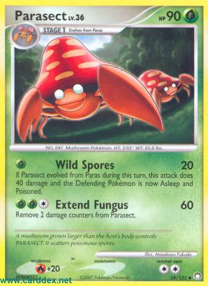 Kosten: Wenn Parasek sich in diesem Zug aus Paras entwickelt hat, fügt dieser Angriff 40 Schadenspunkte zu und das Verteidigende Pokémon schläft jetzt und ist vergiftet.  Schaden: