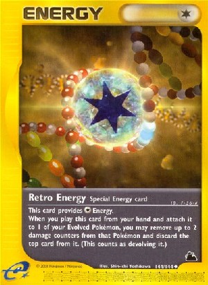 Beschreibung: Diese Karte erzeugt - Energie. Wenn du diese Karte aus deiner Hand spielst und an 1 deiner entwickelten Pokemon anlegst, kannst du bis zu 2 Schadensmarken von diesem Pokemon entfernen und dann seine oberste Karte auf deinen Ablagestapel legen. (Dies zählt als Rückentwicklung dieses Pokemon)