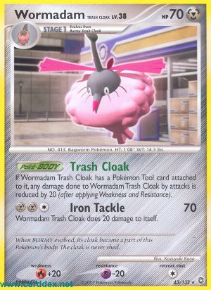 Wenn an Burmadame Lumpenumhang eine Pokémon-Ausrüstungs angelegt ist, wird Schaden, der Burmadame Lumpenumhang durch Angriffe zugefügt wird, um 20 Schadenspunkte reduziert (nachdem Schwäche und Resistenz verrechnet wurden).