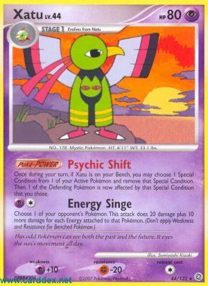 Einmal während deines Zuges kannst du, wenn Xatu auf deiner Bank ist, 1 Speziellen Zustand von 1 deiner Aktiven Pokémon wählen und 1 diesen Speziellen Zustand entfernen. Danach wähle 1 Verteidigendes Pokémon, das jetzt von diesem Speziellen Zustand betroffen ist.