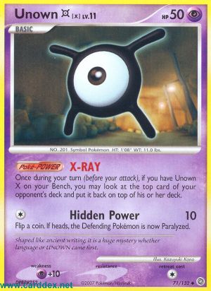 Einmal während deines Zuges (vor deinem Angriff) kannst du, wenn Icognito X auf deiner Bank ist, die oberste Karte des Decks deines Gegners anschauen und auf sein Deck zurücklegen.