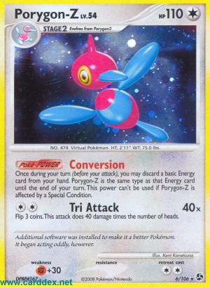 Einmal während deines Zuges (vor deinem Angriff) kannst du 1 Basis-Energiekarte aus deiner Hand auf deinen Ablagestapel legen. Porygon-Z ist bis zum Ende deines Zuges ein Pokémon desselben Typs wie die abgelegte Basis-Energiekarte. Diese Poké-Power kann nicht benutzt werden, wenn Porygon-Z von einem Speziellen Zustand betroffen ist.