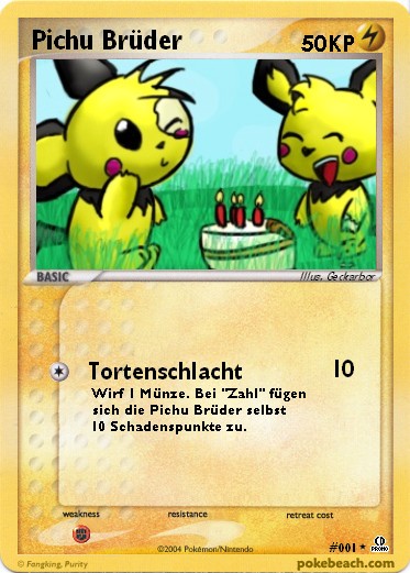 Kosten: Wirf 1 Münze. Bei 'Zahl' fügen sich die Pichu Brüder selbst 10 Schadenspunkte zu.  Schaden:
