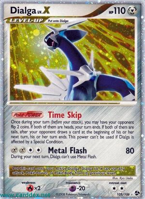 Einmal während deines Zuges (vor deinem Angriff), kannst du deinen Gegner 2 Münzen werfen lassen. Wenn beide „Kopf“ gezeigt haben, ist dein Zug jetzt beendet. Wenn beide „Zahl“ gezeigt haben, endet der nächste Zug deines Gegners, nachdem er zu Beginn seines Zuges eine Karte gezogen hat. Diese Poké-Power kann nicht benutzt werden, wenn Dialga von einem Speziellen Zustand betroffen ist.