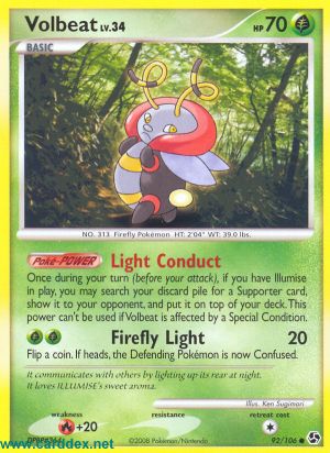 Einmal während deines Zuges (vor deinem Angriff) kannst du, wenn du Illumise im Spiel hast, deinen Ablagestapel nach 1 Unterstützerkarte durchsuchen, sie deinem Gegner zeigen und auf dein Deck legen. Diese Poké-Power kann nicht benutzt werden, wenn Volbeat von einem Speziellen Zustand betroffen ist.