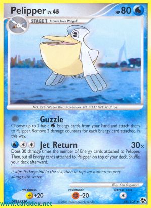 Wähle bis zu 2 -Basis-Energiekarten von deiner Hand und lege sie an Pelipper an. Entferne für jede so angelegte Energiekarte 2 Schadensmarken von Pelipper.