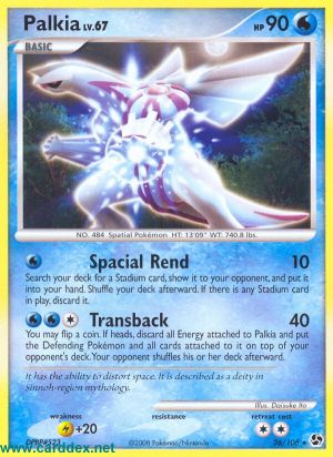 Du kannst 1 Münze werfen. Bei „Kopf“ lege alle Energien, die an Palkia angelegt sind, auf deinen Ablagestapel. Danach lege das Verteidigende Pokémon und alle an es angelegten Karten auf das Deck deines Gegners. Dein Gegner mischt sein Deck danach.