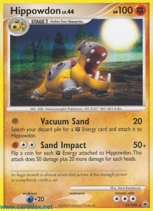 Kosten: Durchsuche deinen Ablagestapel nach 1 -Energiekarte und lege sie an Hippoterus an.  Schaden: