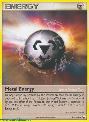 Schaden, der dem Pokémon, an das Metall-Energie angelegt ist, durch Angriffe zugefügt wird, wird um 10 reduziert (nachdem Schwäche und Resistenz verrechnet wurden). Dieser Effekt wirkt nur, wenn die Metall-Energie an einem Pokémon vom Typ angelegt ist. Metall-Energie spendet -Energie. (Zählt nicht als Basis-Energiekarte.)