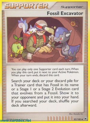 Durchsuche dein Deck oder deinen Ablagestapel nach 1 Trainerkarte mit Fossil im Namen oder einer Evolutionskarte der Phase 1 oder Phase 2, die sich aus einem Fossil entwickelt. Zeige sie deinem Gegner und nimm sie auf die Hand. Falls du dein Deck durchsucht hast, mische es danach.