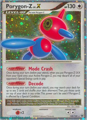 Einmal während deines Zuges (vor deinem Angriff) kannst du, wenn Porygon-Z LV.X von deiner Hand auf dein aktives Porygon-Z legst, alle Spezial-Energiekarten, die an Pokémondeines Gegners angelegt sind, auf seinen Ablagestapel legen.
