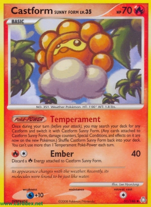 | Einmal während deines Zuges (vor deinem Angriff) kannst du dein Deck nach einer beliebigen Formeo-Karte durchsuchen und gegen Formeo Sonnenform austauschen. (Alle an Formeo Sonnenform angelegten Karten, Schadensmarken, Speziellen Zustände und anderen Effekte werden auf das neue Pokémon übertragen.) Wenn du das machst, lege Formeo Sonnenform auf dein Deck. Mische dein Deck danach. Du kannst nicht mehr als 1 Temperament Poké-Power pro Zug benutzen. |