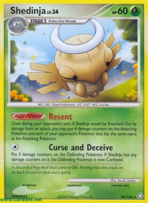 Einmal während des Zuges deines Gegners kannst du, wenn Ninjatom durch Schaden eines Angriffs kampfunfähig würde, 4 Schadensmarken auf das Angreifende Pokémon und jedes Pokémon deines Gegners mit demselben Namen wie das Angreifende Pokémon legen.