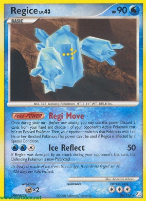 Einmal während deines Zuges (vor deinem Angriff) kannst du diese Poké-Power benutzen. Lege 2 Karten von deiner Hand auf deinen Ablagestapel und wähle 1 Aktives Pokémon deines Gegners, das kein entwickeltes Pokémon ist. Danach tauscht dein Gegner das gewählte Pokémon gegen 1 Pokémon auf seiner Bank aus. Diese Poké-Power kann nicht benutzt werden, wenn Regice von einem Speziellen Zustand betroffen ist.
