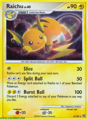 Kosten: Entferne 1 an Raichu angelegte Energiekarte und lege sie an 1 Pokémon auf deiner Bank an.  Schaden: