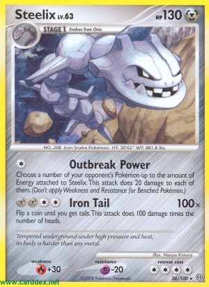 Wähle eine Anzahl gegnerischer Pokémon, die höchstens der Anzahl der an Stahlos angelegten Energien entspricht. Dieser Angriff fügt jedem gewählten Pokémon 20 Schadenspunkte zu. (Wende Schwäche und Resistenz bei Pokémon auf der Bank nicht an.)