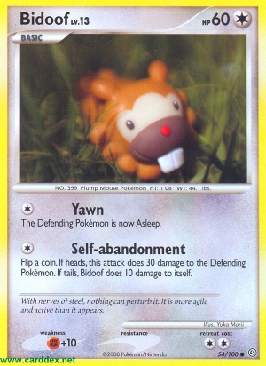 Kosten: Wirf 1 Münze. Bei „Kopf“ fügt dieser Angriff dem Verteidigenden Pokémon 30 Schadenspunkte zu. Bei „Zahl“ fügt Bidiza sich selbst 10 Schadenspunkte zu.  Schaden: