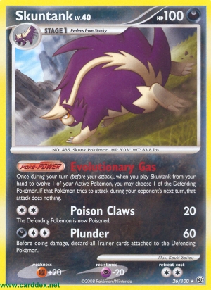 Once during your turn (before your attack), when you play Skuntank from your hand to evolve 1 of your Active Pokémon, you may choose 1 of the Defending Pokémon. If that Pokémon tries to attack during your opponent's next turn, that attack does nothing.