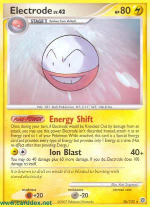 Once during your turn, if Electrode would be Knocked Out by damage from an attack, you may use this power. Electrode isn't discarded. Instead, attach it as an Energy card to 1 of your Pokémon. While attached, this card is a Special Energy card and provides every type of Energy but provides only 1 Energy at a time. (Has no effect other than providing Energy.)
