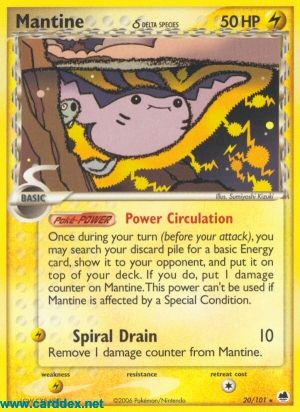 Einmal während deines Zuges (vor deinem Angriff) kannst du deinen Ablagestapel nach einer Basis-Energiekarte durchsuchen, sie deinem Gegner zeigen und auf dein Deck legen. Wenn du das machst, lege eine Schadensmarke auf Mantax. Diese Poké-Power kann nicht benutzt werden, wenn Mantax von einem Speziellen Zustand betroffen ist.