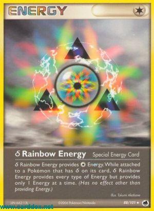 Beschreibung: δ Regenbogen-Energie liefert Energie. Wenn sie an ein Pokémon angelegt ist, auf dem δ zu sehen ist, zählt sie als jeder beliebige Basis-Energietyp, spendet aber immer nur 1 Energie auf einmal. (Sie hat keinen Effekt, außer dass sie Energie spendet.)
