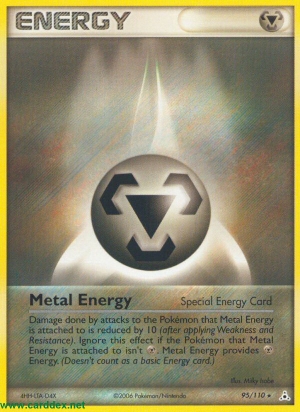 Beschreibung: Schaden, der dem Pokémon, an das Metall-Energie angelegt ist, durch Angriffe zugefügt wird, wird um 10 reduziert (nachdem Schwäche und Resistenz verrechnet wurden). Dieser Effekt wirkt nur, wenn die Metall-Energie an einem Pokémon vom Typ angelegt ist. Metall-Energie liefert -Energie. (Zählt nicht als Basis-Energiekarte.)