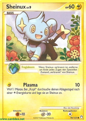 Kosten: Wirf 1 Münze. bei 'Kopf' durchsuche deinen Ablagestapel nach einer -Energiekarte und lege sie an Sheinux an.  Schaden: