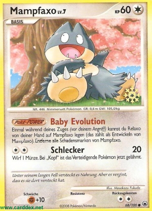 Einmal während deines Zuges (vor deinem Angriff) kannst du Relaxo von deiner Hand auf Mampfaxo legen (das zählt als Entwickeln von Mampfaxo). Entferne alle Schadensmarken von Mampfaxo.