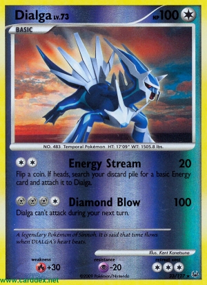 Kosten: Flip a coin. If heads, search your discard pile for a basic Energy card and attach it to Dialga.  Schaden: