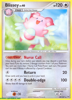 Once during your turn (before your attack), you may discard a card from your hand. If you do, remove 2 damage counters from 1 of your Pokémon. You can't use more than 1 Nurse Call Poké-Power each turn. This power can't be used if Blissey is affected by a Special Condition.