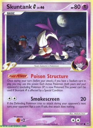 Once during your turn (before your attack), if you have a Stadium card in play, you may use this power. Each Active Pokémon (both yours and your opponent's) (excluding Pokémon SP) is now Poisoned. This power can't be used if Skuntank G is affected by a Special Condition.