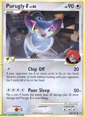 Kosten: Flip a coin. If heads, this attack does 50 damage plus 30 more damage and Purugly G is now Asleep.  Schaden: