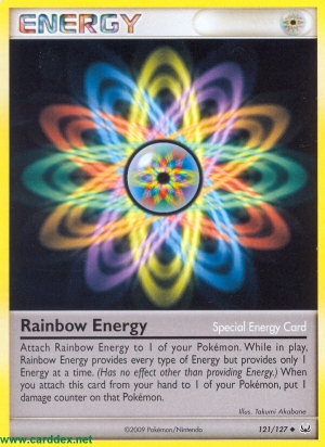 Attach Rainbow Energy to 1 of your Pokémon. While in play, Rainbow Energy provides every type of Energy but provides only 1 Energy at a time. (Has no effect other than providing Energy.) When you attach this card from your hand to 1 of your Pokémon, put 1 damage counter on that Pokémon.