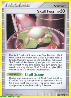 Play Skull Fossil as if it were a Basic Pokémon. (Skull Fossil counts as a Trainer card as well, but if Skull Fossil is Knocked Out, this counts as a Knocked Out Pokémon.) Skull Fossil can't be affected by any Special Conditions and can't retreat. At any time during your turn before your attack, you may discard Skull Fossil from play. (This doesn't count as a Knocked Out Pokémon.)