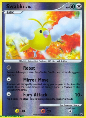 Kosten: If Swablu was damaged by an attack during your opponent's last turn, this attack does the same amount of damage done to Swablu to the Defending Pokémon.  Schaden: