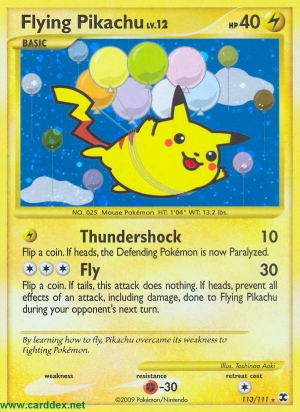 Wirf 1 Münze. Bei „Zahl“ hat dieser Angriff keine Auswirkungen. Bei „Kopf“ verhindere während des nächsten Zuges deines Gegners alle Effekte eines Angriffs, einschließlich Schaden, die Fliegendes Pikachu zugefügt würden.