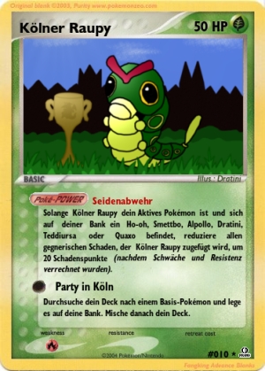 Solange Kölner Raupy dein Aktives Pokémon ist und sich auf deiner Bank ein Ho-oh, Smettbo, Alpollo, Dratini, Teddiursa oder Quaxo befindet, reduziere allen gegnerischen Schaden, der Kölner Raupy zugefügt wird um 20 Schadenspunkte (nachdem Schwäche und Resistenz verrechnet wurden).