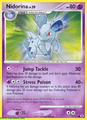 Kosten: Wenn auf Nidorina mindestens 1 Schadensmarke liegt, fügt dieser Angriff 40 Schadenspunkte plus 20 weitere Schadenspunkte zu und das Verteidigende Pokémon ist jetzt vergiftet.  Schaden: